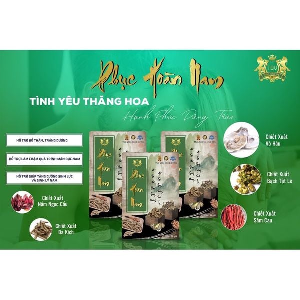 Công Dụng Thực Phẩm Bảo Vệ Sức Khỏe PHỤC HOÀN NAM Giúp bổ thận, tráng dương. hỗ trợ giảm xuất tinh sớm, rối loạn cương dương, kéo dài thời gian quan hệ.